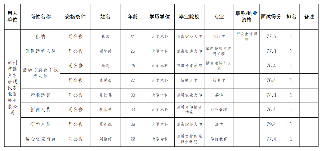 根据彭州市蔬乡农语现代农业发展有限公司2025年4月29日发布的招聘公告及招聘相关规定,经面试、背景调查、体检等程序,拟聘张洁等人员,现将名单予以公示。