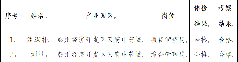 按照2025年6月30日发布的《2025年彭州市产业园区面向社会公开招聘员额制工作人员的公告》规定,经笔试、面试、体检、考察,现将彭州经济开发区天府中药城拟聘人员名单进行公示。