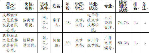 根据成都湔江文化旅游发展有限公司2025年10月24日发布的招聘公告及招聘相关规定,经笔试、面试、背景调查、体检等程序,现将拟聘人员名单予以公示。