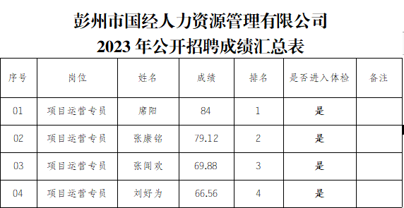 彭州市国经人力资源管理有限公司2023年公开招聘面试工作已顺利结束。按照2023年7月13日公开发布的《彭州市国经人力资源管理有限公司2023年公开招聘公告》规定,现将成绩及进入体检人员名单公告如下。